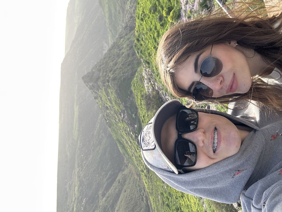 A close-up, selfie-style photograph features two young adults in the foreground against a panoramic backdrop of verdant hills and a distinct peak, consistent with the landscape of the Gamla Nature Reserve within the Golan Regional Council, Israel. The individual on the left, appearing male, wears a grey hooded sweatshirt adorned with small red patterns, a light-colored baseball cap featuring a dark, tiger-like animal emblem, and black, square-framed sunglasses. Visible dental braces are present on his upper teeth, and he smiles directly towards the camera. The reflection in his sunglasses shows a person holding a device, presumably a smartphone. To the right, the second individual, appearing female, has long, dark brown hair and wears round, dark-tinted sunglasses. She exhibits a small stud piercing on her left nostril and small hoop earrings. Her gaze is directed slightly to her left, with a subtle smile. The background consists of rolling green hills and deep valleys, heavily vegetated. A prominent, somewhat conical rocky peak stands in the mid-distance. The sky above is bright and appears slightly hazy. Patches of purple wildflowers are visible on the hillside to the right. A faint metal railing is partially visible on the far right, suggesting an overlook.