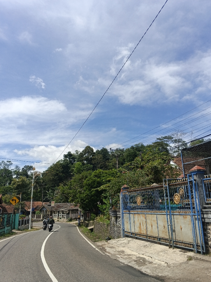 A winding road curves through a rural landscape. Two motorbikes are moving along the road. Lush green trees and foliage cover the hillside to the right. A blue gate stands prominently on the right, partially blocking the view. Overhead, power lines stretch across a bright sky filled with scattered clouds. Houses and buildings are visible along the roadside, nestled amongst the trees.