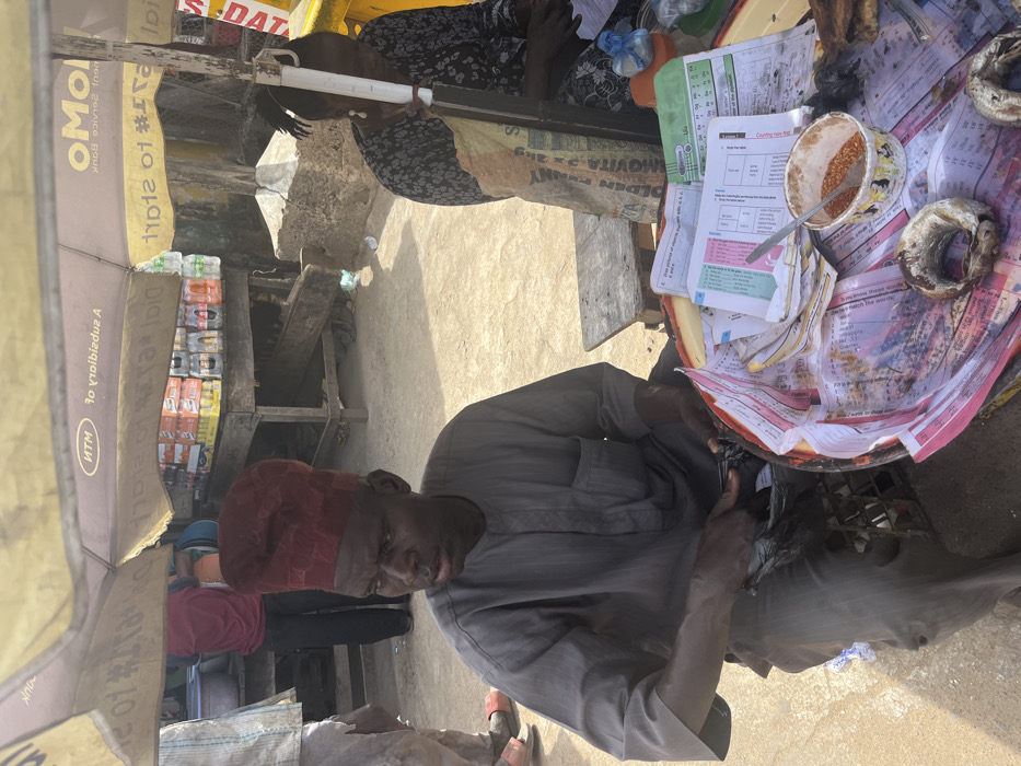An outdoor market scene in the city of Gwong, Nigeria, under a large, light-colored umbrella bearing inverted MTN and oMo branding. In the foreground-left, an adult male with dark skin wears a grey tunic and a maroon, textured cap. He is seated, actively manipulating a dark object in his lap, and observing something to his left. Immediately in front of him is a circular, metal tray with a pink rim, covered with various papers, including what appear to be school worksheets and newsprint. On this tray, several pieces of dried, circular fish are visible, alongside a small white cup containing red spice and a metal spoon. In the mid-ground-right, partially obscured by a white pole, an adult female with dark skin is seated, wearing a dark patterned dress. Her head is bowed, and she appears to be engaged with an activity in front of her, with a light brown "Golden Penny Novita" sack draped across her. In the background-left, a wooden stall is laden with stacked crates of bottled beverages. The ground is an uneven, light-colored, dusty surface. Other individuals are partially visible in the background-left.