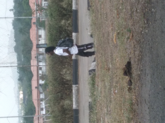 The scene depicts an outdoor environment, located in Osu, Nigeria, under an overcast sky. In the midground, a lone individual, appearing male with long dark dreadlocks, walks rightward across a paved surface, looking to the right. The individual wears a white t-shirt, dark trousers with a white stripe on the left leg, and carries a dark backpack. Immediately behind the person is a concrete curb painted black and white. Behind the curb, a dense line of green bushes spans the width of the image. The foreground consists of dry, patchy dirt and sparse grass, with a dark, irregular pile of organic matter present on the ground. In the background, a wire fence, likely chain-link, is visible. Behind this fence are several one-story buildings featuring reddish-brown tiled roofs. Further in the distance, dense green foliage, including palm trees, and hazy hills are discernible. A tall, slender metal tower is partially visible on the right side of the background. No other individuals or active interactions are observed.