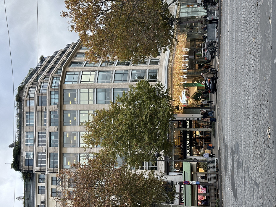 The image displays a street scene in Paris, France, at the corner of Boulevard des Capucines and Rue de la Paix, near the Place de l'Opéra. The central subject is a multi-story commercial building, identified by the "one" logo on its facade as the "Opéra One" building. This light-colored structure features a rounded corner, numerous large, rectangular windows, and several upper-floor balconies. The flat rooftop exhibits some greenery and satellite dishes against an overcast, grey sky. At ground level, the corner tenancy is a "LACOSTE" flagship store, heavily adorned with warm white string lights draped across its facade, incorporating a large, illuminated crocodile logo. To the left of Lacoste, a "BOULANGERIE LOUISE" is visible, and further left, a "LANCÔME" sign is partially seen. The foreground consists of a cobblestone street surface. Several pedestrians are present on the sidewalks in front of the retail establishments and moving along the street. A dark-colored sedan is positioned in the street near the Lacoste store, and a bicycle is parked against metal pedestrian barriers. Deciduous trees with varying autumnal foliage (some green, some brown) are dispersed along the street. Overhead power lines are visible, and streetlights are active alongside decorative string lights on some trees.