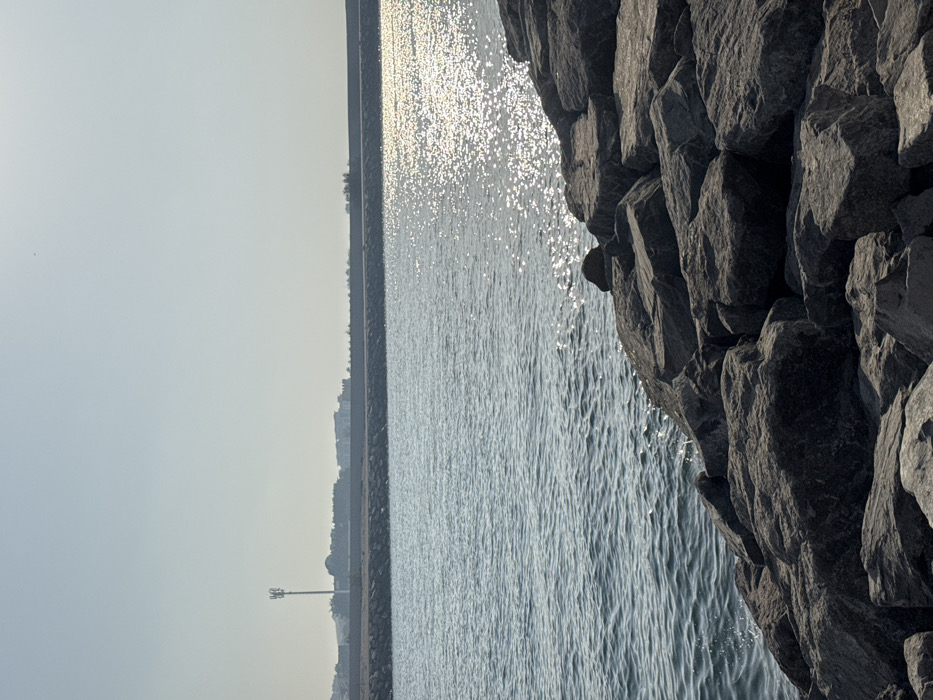 The image depicts a waterfront scene in Business Bay, United Arab Emirates, under a bright, hazy sky. In the foreground, a substantial formation of dark grey, angular rocks, consistent with a breakwater or riprap, occupies the lower right and extends towards the lower-mid left. Adjacent to these rocks, a body of water with discernible ripples is present, reflecting significant sun glint on its surface, particularly on the right side. The midground features a low, flat landmass or distant shore, forming a horizontal line across the frame. In the background, beyond this landmass, a hazy skyline reveals a tall communication tower positioned towards the left, with scattered low-rise buildings and sparse vegetation extending along the distant horizon. No individuals or active subjects are visible.