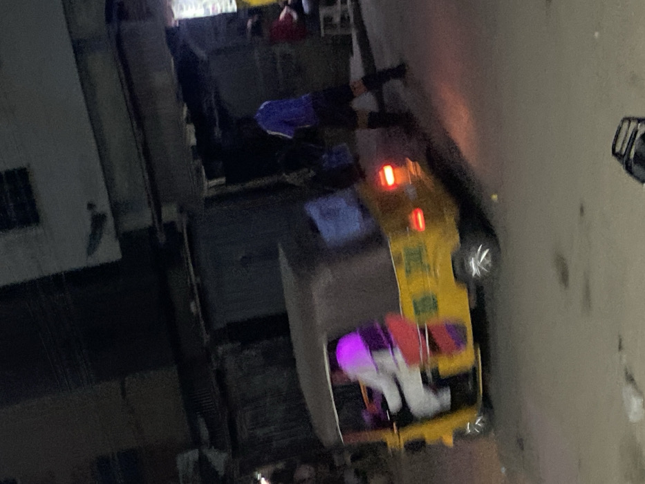 A grainy, low-light image shows a yellow ambulance with flashing lights parked on a street at night