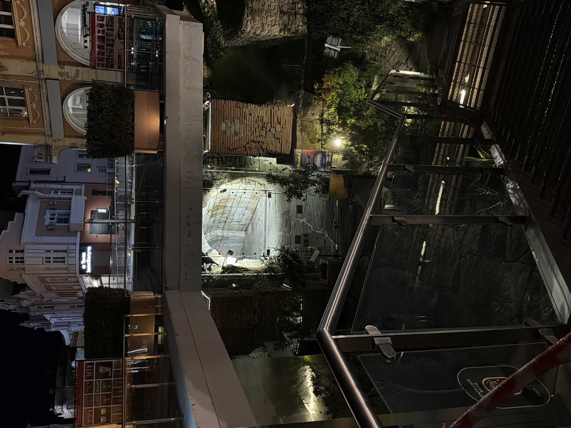 At night, an urban landscape reveals a tunnel illuminated in white, framed by rough-hewn stone walls. Above, greenery and a brick structure complement the rough terrain. A modern building with arched windows and a facade displaying images stands nearby. Glass barriers and metal railings define the foreground, creating a sharp contrast with the historic elements. Red and white safety tape is visible.