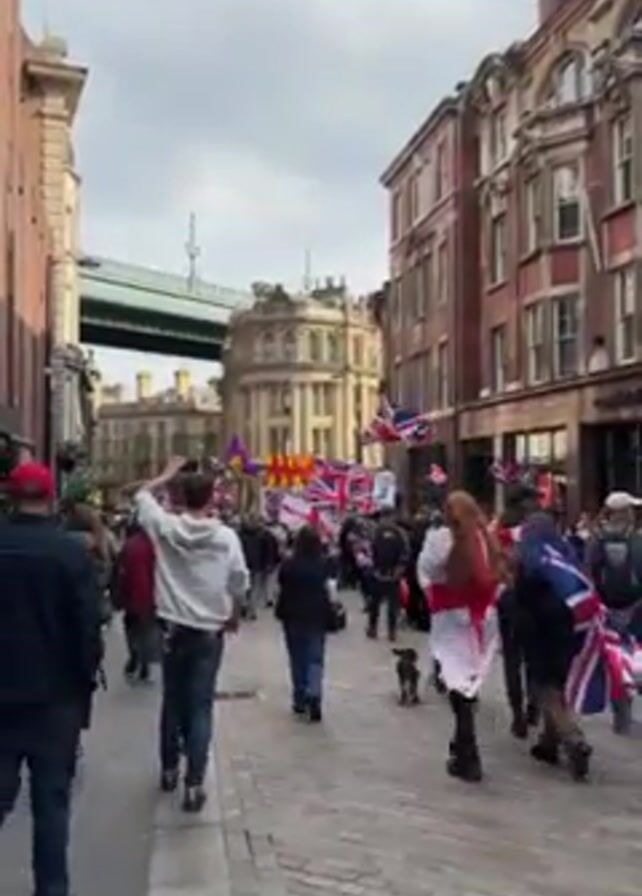 crowd of people walking down a narrow cobblestone street. Most are carrying or wearing British flags, and some also have rainbow flags. The street is lined with buildings, with a bridge visible in the distance. People are walking in the same direction, and some are waving their flags. A small dog walks alongside people in the middle of the crowd. The sky is overcast.