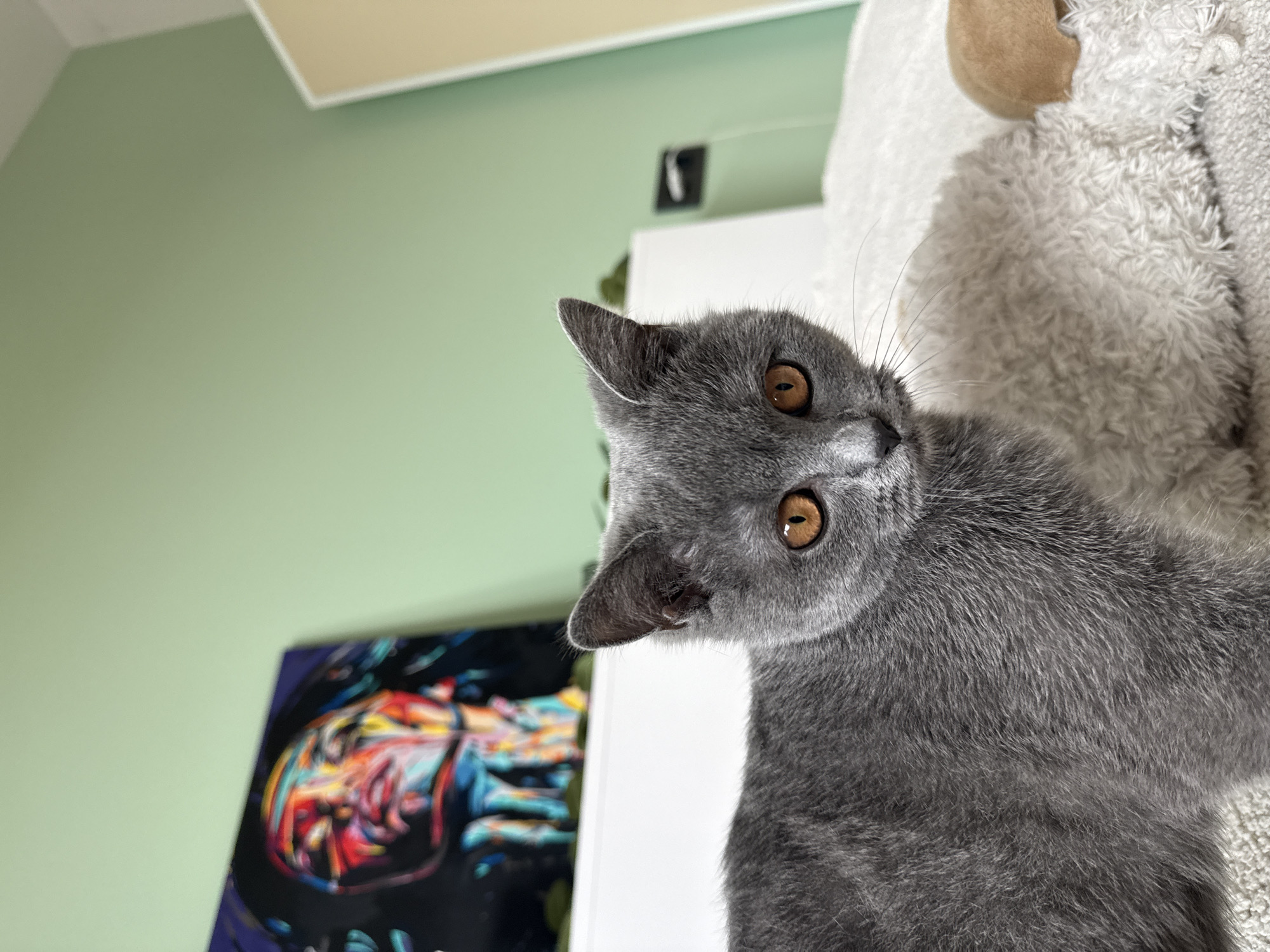 A gray cat with amber eyes is lying on a white, fluffy surface, possibly a blanket or bed. The cat's head is tilted, and it appears to be looking at the camera. Behind the cat is a light green wall with a colorful abstract painting hanging on it. There is a white cabinet in the background, and a beige-colored corner of what appears to be a ceiling. The location is not determinable from the image, as there are no identifiable landmarks.