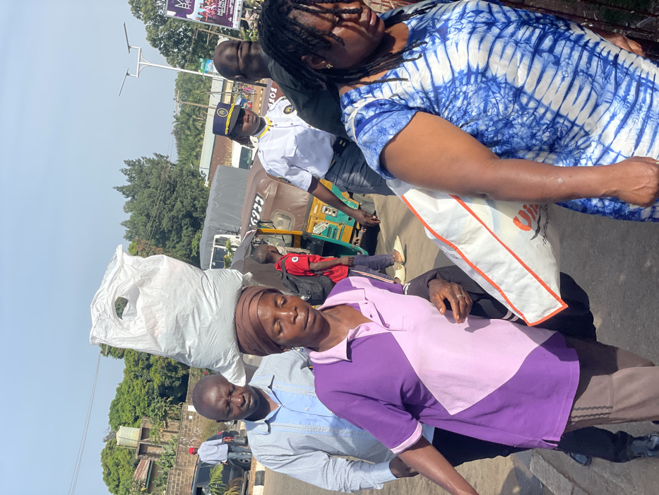 This image depicts a bustling street scene in Barakin Lerawi, Nigeria, under clear daytime conditions. In the foreground, from left to right: A woman with a brown headwrap and earrings is walking towards the left, balancing a large, white plastic bag on her head. She wears a purple and light purple two-tone polo shirt, dark trousers, and carries a dark jacket or fabric over her left arm. A ring is visible on her left ring finger. Directly behind her and slightly to the left, a man in a light blue patterned long-sleeved shirt and dark trousers walks with his gaze directed downward. To the far right, a woman with dark dreadlocks is walking towards the left, wearing a blue and white tie-dye patterned dress. She carries a large white shopping bag with red trim and a partially visible "Via" logo over her right shoulder. In the midground: A woman in a white uniform shirt, dark trousers, and a dark peaked cap with gold accents, possibly a security officer or traffic warden, stands facing forward, looking towards the viewer. Behind her, a brown and yellow/green auto-rickshaw (Keke Napep) with the number "6933" visible on its rear is parked or moving slowly away from the viewer. A young individual in a red t-shirt and light-colored sandals is visible near the auto-rickshaw. Further back, a dark-colored truck with a grey tarp covering its bed is present. The background features green foliage and trees, indicating a vegetated area. A light-colored building with a dark roof and an elevated water tank is visible on the far left. Utility poles and overhead wires traverse the scene. On the far right, a multi-armed street light fixture is visible, along with a large billboard displaying purple graphics and text, including "MY NK" and "MUSIC." The ground surface appears to be paved, consistent with a road or urban pathway. The sky is bright and cloudless.