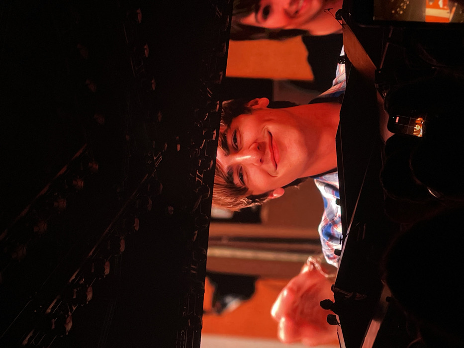 A low-angle shot displays a screen showing a young man with a grin and short brown hair. He wears a blue and red plaid shirt. Above him, another blurry figure can be seen on the screen. To the left, a dark and textured metallic structure dominates, while to the right, dark silhouettes of people and a phone taking a picture are visible. The overall lighting is dim and reddish.