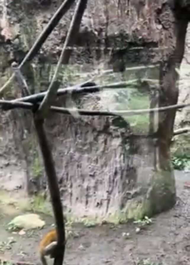 small, light-brown monkey climbing a thin, brown tree trunk inside an enclosure. The enclosure has a rocky wall backdrop with some green vegetation at the base. The tree trunk is part of a larger structure of branches and posts overhead. The ground is covered in dirt and moss. The monkey moves slowly, clinging to the trunk with its limbs and tail. The scene appears to be a zoo exhibit or animal sanctuary.