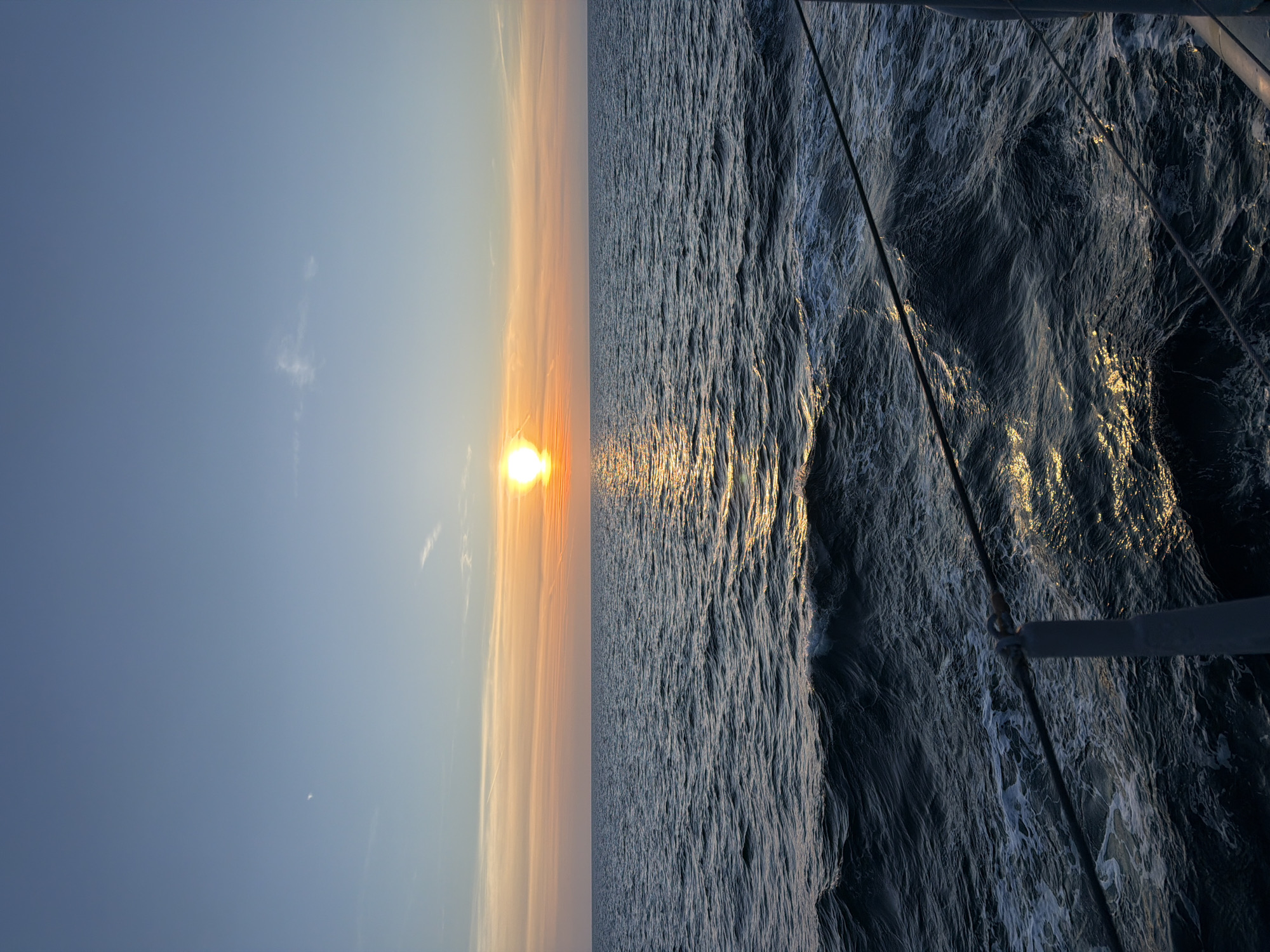 The image depicts an open body of water at sunset, viewed from a vessel. The sun, a bright orange-yellow orb, is positioned just above the horizon, slightly to the left of the center, casting a shimmering golden reflection path across the dark blue-grey water towards the viewer. The sky transitions from a deep blue at the top to lighter blue and then a band of orange, yellow, and peach hues at the horizon. A faint crescent moon is visible in the upper left sky, and several linear contrails are present in the upper sky, some extending into the colored horizon band. The water surface is textured with numerous waves and ripples, with white foam visible on some crests. In the foreground, on the right side, a dark, vertical stanchion or post is partially visible, from which a taut, dark cable or rope extends diagonally across the lower right quadrant. Another cable is partially visible further down. No individuals or specific landforms are visible. The scene is set over open water, location Unknown, Unknown.