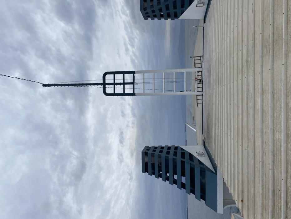 The image captures a forward-facing perspective from the upper deck of a large vessel, likely a ship or ferry, located in the waters of Unknown, Greece. The foreground consists of a light-colored, ribbed deck surface. Centrally, a tall, white mast-like structure with a dark, rectangular top frame and visible horizontal cross-members rises; a string of small, dark elements ascends its peak, and multiple lines or cables descend from it. Flanking this mast are two dark blue-grey, funnel-like structures, each featuring a stepped or louvered design on its exterior and a white base. Beyond these structures, a calm, dark blue-grey body of water extends, with several distant ship silhouettes visible. A low, hazy landmass, likely mountains or hills, is discernible on the horizon. The sky is uniformly overcast with thick, grey clouds. No individuals, specific actions, or interactions are present within the scene.