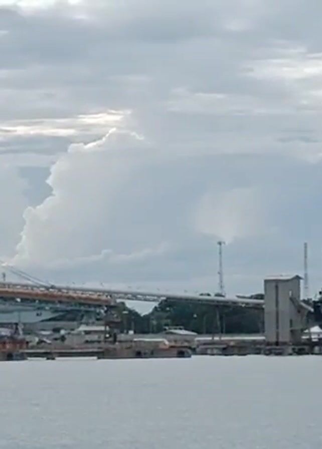 waterfront industrial area under a cloudy sky. Multiple large industrial buildings and structures are visible along the water's edge, including what appears to be a factory or processing plant. There are conveyor belts, silos, and other industrial equipment. Two ships are docked near the industrial facilities. One appears to be a cargo ship, and the other is a smaller blue and white passenger vessel. A tall crane is positioned near the ships. The water in the foreground is calm and gray.