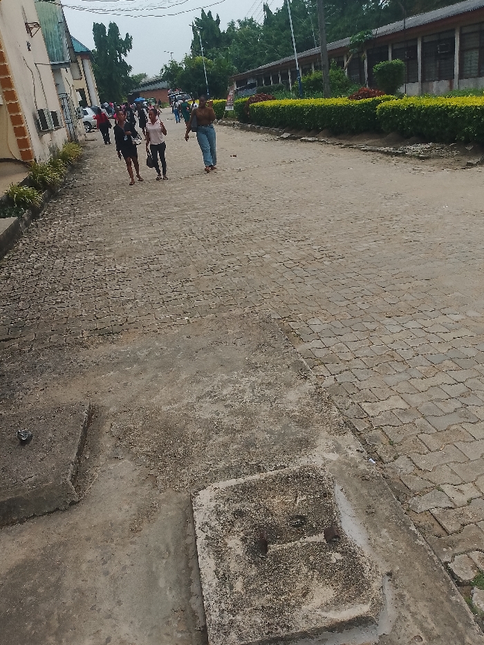 The image displays an outdoor scene within the city of Choba, Nigeria, characterized by a paved thoroughfare flanked by buildings and vegetation under an overcast sky. In the immediate foreground, two rectangular, weathered concrete access covers are visible, set into an uneven concrete surface. One cover exhibits two rust-colored metallic studs. This concrete transitions into an interlocking paver surface that forms a pathway or road extending into the distance. On the left side of the scene, a multi-story building with a light-colored facade, brown trim, and several external air conditioning units is present. Green foliage lines its base. On the right side, a long, low-rise building with multiple window openings is situated behind a manicured hedge of green bushes. Approximately 15 to 20 individuals are present on the paved path. Three women are prominent in the midground, walking generally towards the viewer's left: 1. A woman wearing a dark top, dark shorts, and sandals, carrying a dark bag. 2. A woman wearing a light-colored short-sleeved top and dark pants, carrying a dark handbag. 3. A woman wearing a brown long-sleeved top and light blue jeans. All individuals appear to be in transit. In the background, a dense cluster of tall green trees dominates the skyline. A white vehicle is partially visible further down the path on the left, and a street light pole rises on the right side of the path in the mid-distance. The sky is uniformly light gray.