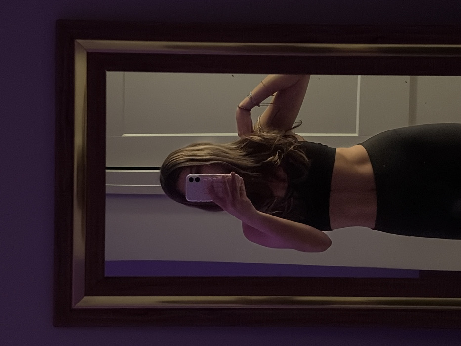 A mirror reflects a woman holding a lavender phone, partially obscuring her face. She wears a black crop top and leggings, revealing a slim waist. Her hair is brown with blonde highlights. Multiple rings adorn her fingers. The background shows a white wall with a horizontal architectural detail and a purple light strip above. The mirror has a dark wooden frame.