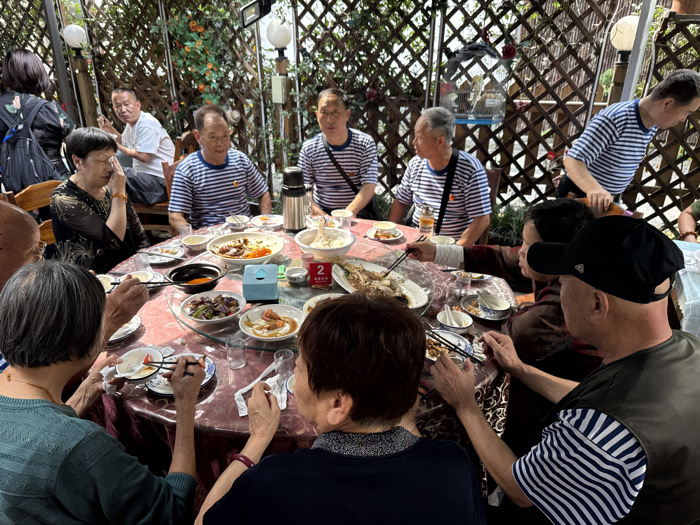 This image captures a group dining scene, likely in an outdoor or semi-outdoor restaurant setting, located in Xihu District, China