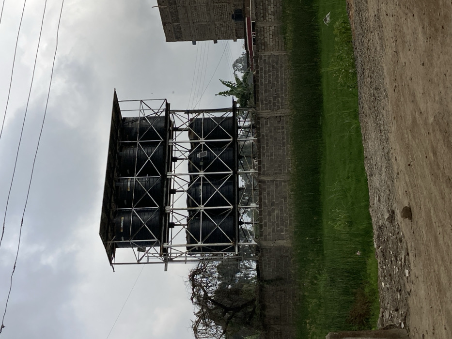A tower supports multiple black water tanks. The structure is made of a steel frame, braced with diagonal supports. A brick wall borders a grassy area near the tanks. A second brick building is visible further back. Power lines run along the left side of the image. A cloudy sky is overhead. A tree with bare branches is near the base of the tower. A concrete road edge is on the right.