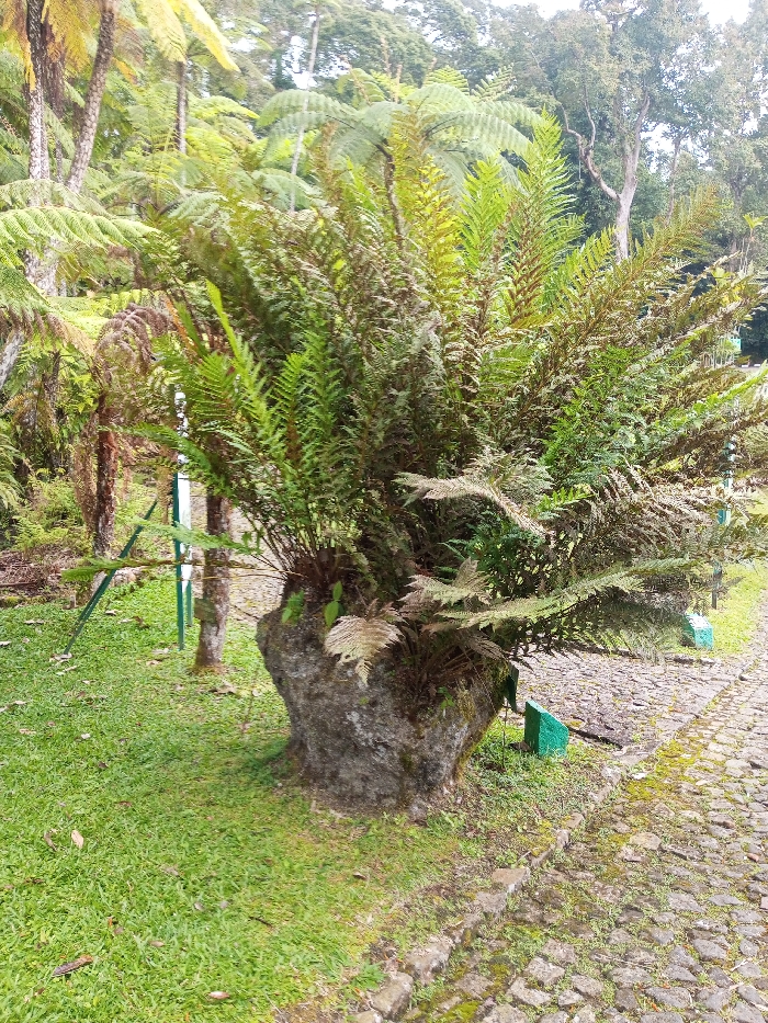 This image captures a lush botanical scene in Pachmarhi, India. A prominent cluster of ferns, displaying both vibrant green and reddish-brown fronds, grows from an irregular, moss-covered grey rock formation located centrally in the foreground. To the left of this central plant, a manicured green grass lawn extends. To the right, a cobbled pathway, composed of various grey stones with inter-stone moss growth, runs diagonally into the midground. A small, angled, green marker is visible on the grass immediately adjacent to the pathway on the right. In the midground and background, numerous taller tree ferns with distinct fibrous trunks and broad fronds are present, interspersed with other dense forest trees, forming a layered green backdrop. Thin, vertical green support poles are partially visible amongst the vegetation on the left side of the frame. No human figures or animals are present. The scene is illuminated by ambient daylight.