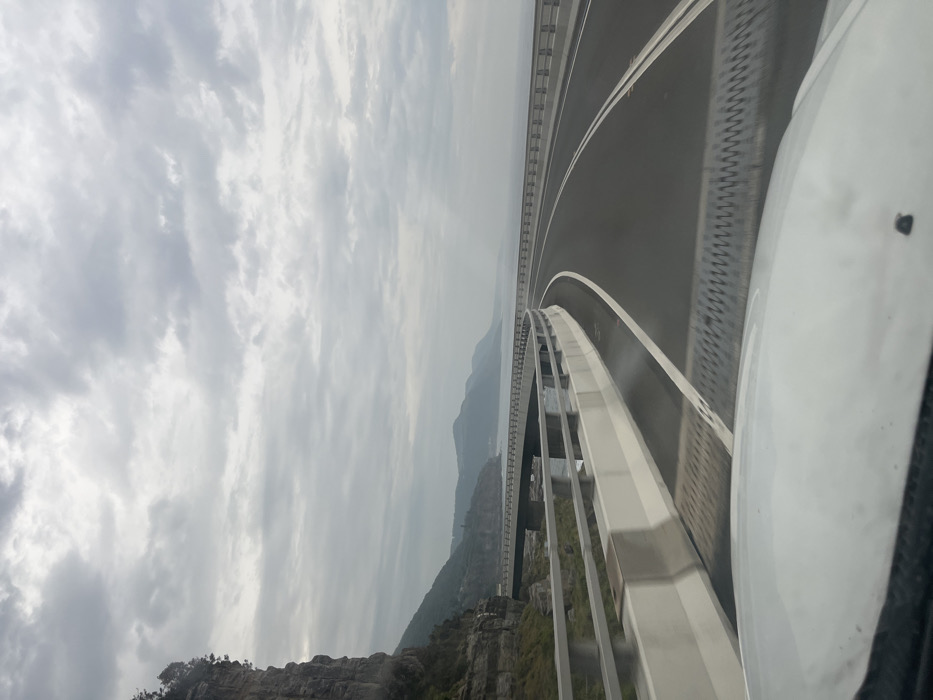A striking, tilted aerial perspective showcases a towering bridge against a backdrop of misty mountains and cloudy sky. The bridge, composed of multiple parallel roadways, curves gracefully, supported by white concrete pillars. Below, rugged cliffs meet lush green vegetation. The sky is filled with varying shades of gray clouds, adding depth. A portion of a vehicle, likely the source of the photo, is visible in the foreground.