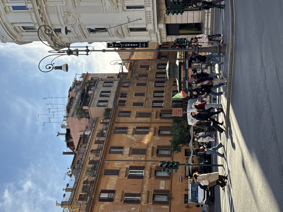 This image presents a daytime urban street scene at a bustling intersection in Rome, Italy