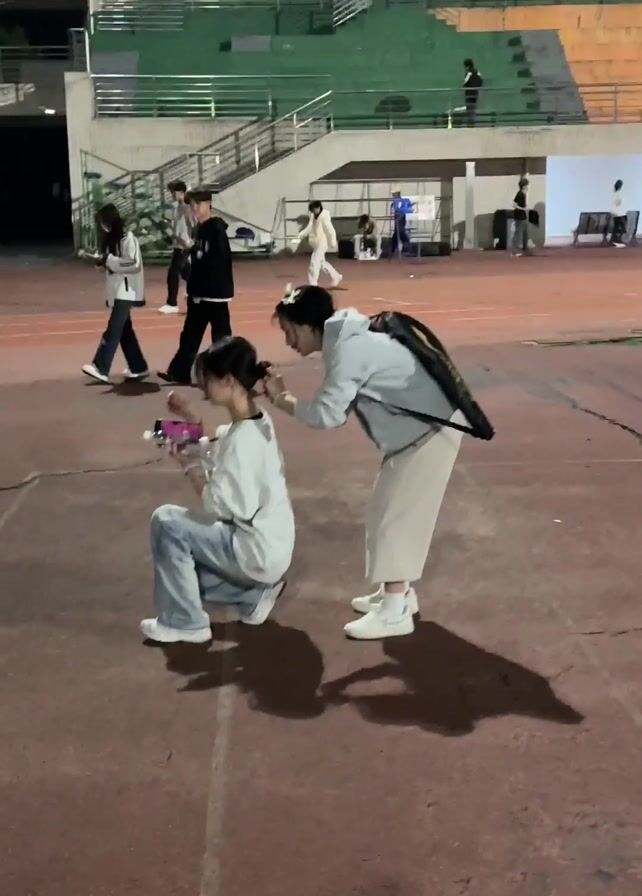 two women on a running track outside in the evening. One woman is kneeling and looking at a small object in her hands. The other woman is standing behind her and fixing the first woman’s hair. There are other people walking and running on the track around them. In the background, there is a building with stadium seating. One of the people on the track is carrying a badminton racket.