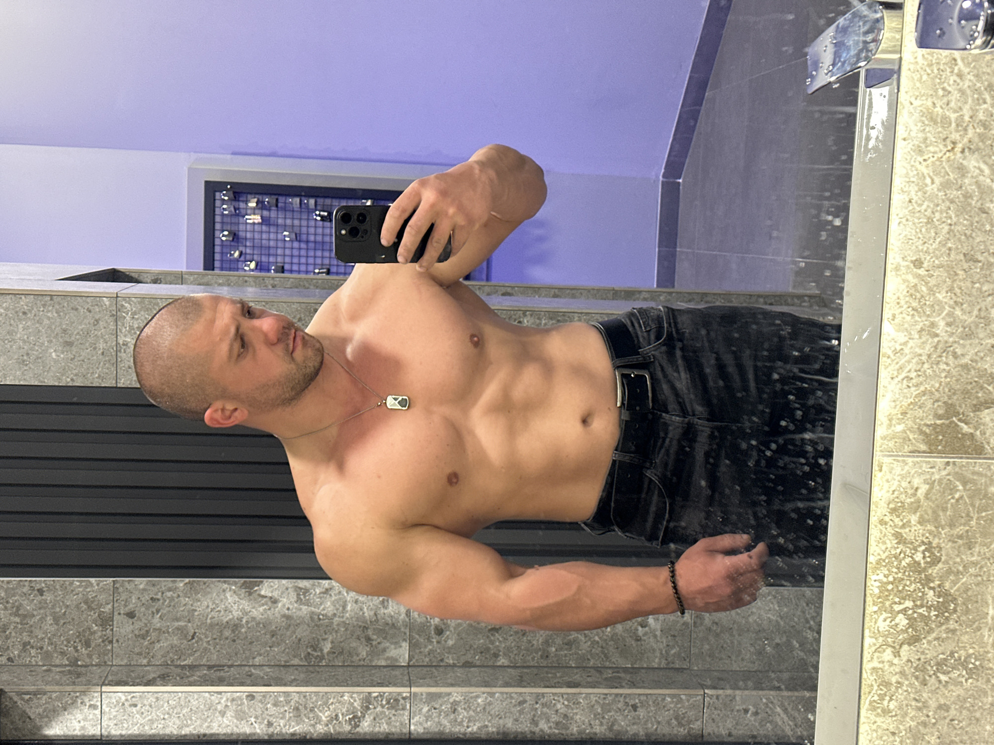 A muscular, bald man is taking a selfie in a bathroom mirror. He is shirtless, wearing jeans and a belt. The background includes gray tiling, a black slat wall, and a purple accent light above. The location appears to be a modern bathroom, potentially in a hotel or apartment. The location in the city of Burgas, Bulgaria is unknown.