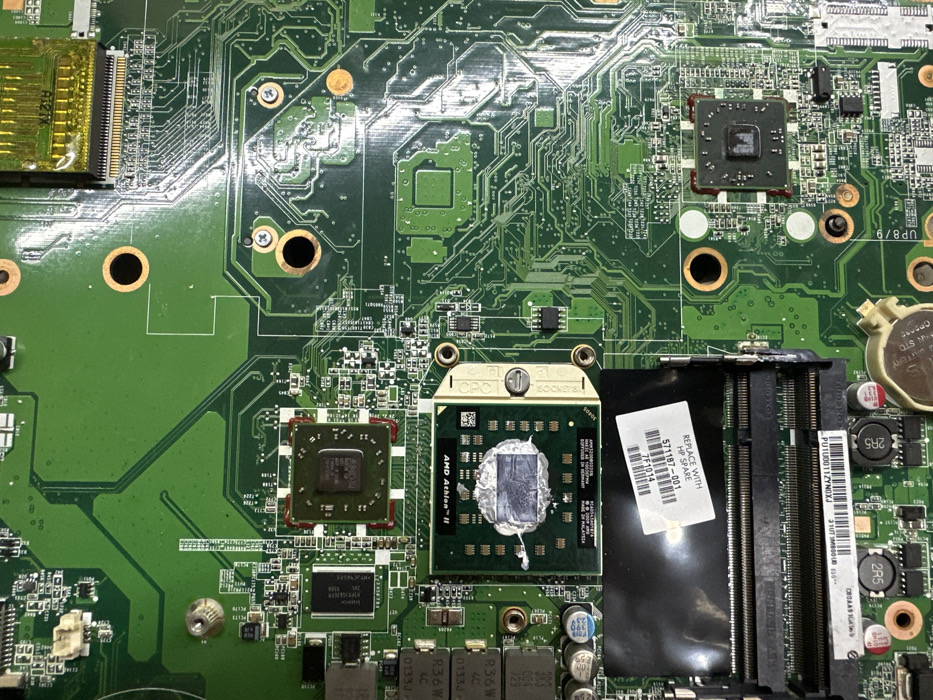 The image displays a green printed circuit board (PCB) from an electronic device, likely a laptop or desktop computer motherboard, viewed from directly above in an indoor, brightly lit environment. No individuals are present. The PCB features numerous surface-mount and through-hole components. Prominently positioned near the center-left is an AMD Athlon II central processing unit (CPU) chip, covered with gray thermal paste on its die. Directly above it, another square integrated circuit, identified by an "AMD" logo, likely represents a graphics processing unit (GPU) or a chipset, also without a heatsink attached. To the lower-left, two black DDR-style memory slots are visible, with a white label affixed nearby. The label reads "REPLACE WITH HP SPARE" followed by part numbers "571187-001" and "7F1014". Various other smaller integrated circuits, capacitors, resistors, and inductors are scattered across the board. A gold-colored ribbon cable connector is present at the upper-right edge. Several screw holes and screws are visible, indicating mounting points for other components or the board within a chassis. A circular CMOS battery is located in the bottom-right quadrant of the board. The overall scene suggests a state of disassembly, repair, or inspection of the electronic hardware. No actions or interactions are depicted. The exact city location is undetermined.