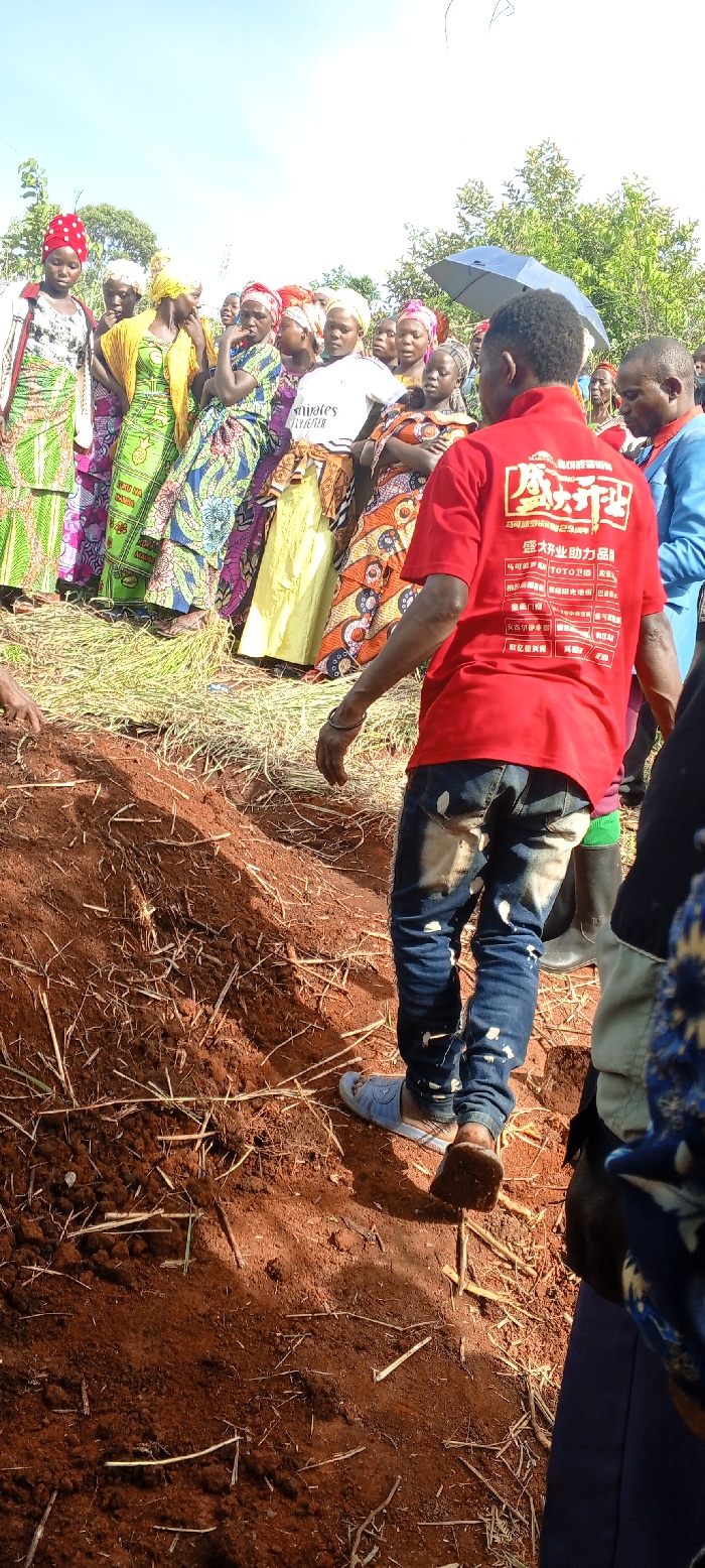An outdoor scene in the city of Namisha, Democratic Republic of the Congo, depicts a gathering around a freshly excavated area of reddish-brown earth