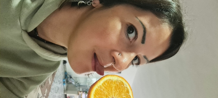 The image displays an adult female subject indoors in Nahariyya, Israel. The subject, positioned in a close-up portrait, has dark hair and a light complexion. Her right eye is wide open, looking towards the viewer. She presents a silver stud piercing on her right nostril and a silver ring septum piercing. Her visible left ear is adorned with two silver hoop earrings, one featuring a dangling chain with a crescent moon charm. She is clad in a light green hooded sweatshirt, with a dark necklace visible beneath its collar. Her tongue is extended horizontally from her mouth towards the right side of the frame. Adjacent to her extended tongue, a cross-section of an orange is visible, revealing its segmented interior and rind. The background elements are out-of-focus, indicating an indoor domestic setting with a light-colored wall and a tiled floor with a pattern in the lower right section.