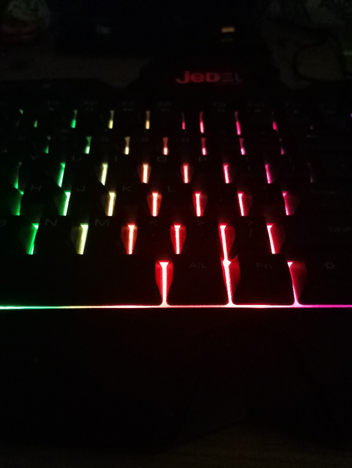 black keyboard with a green, yellow, and red light pattern, which appears to be emanating from the keys