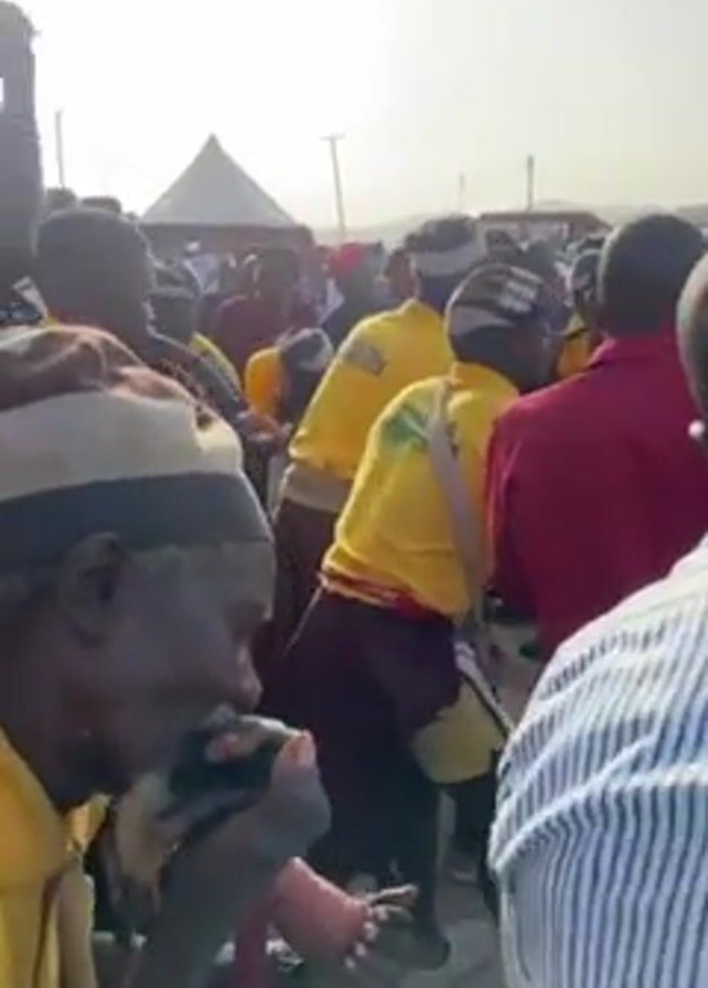 crowd of people. Many are wearing yellow shirts with the word "Nigeria" on them and striped hats. They appear to be playing musical instruments, possibly flutes or pipes, as they are moving and playing together. Behind the group, there is a red car and a white tent visible. The scene appears to be outdoors in daylight.