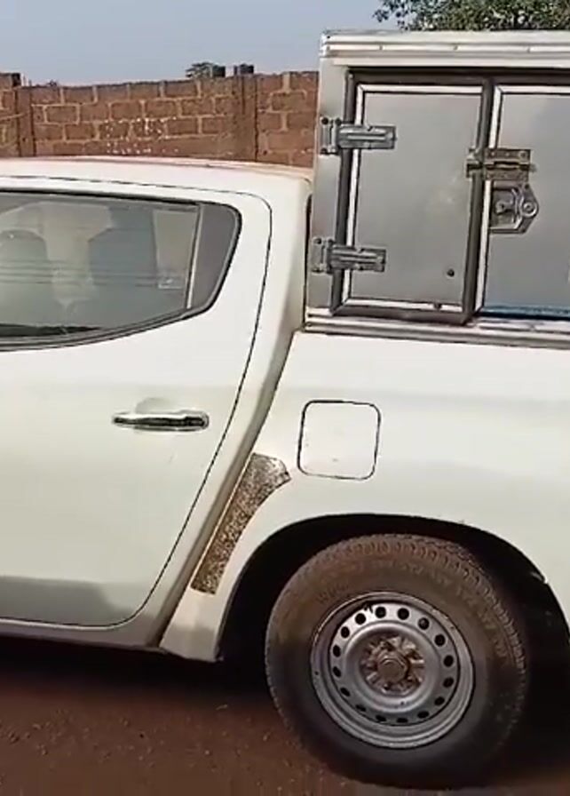 A white four-door pickup truck is parked on a dirt road. The truck has a silver box with two doors mounted in the bed. The rear doors of the truck box are open. A brick wall is visible in the background.