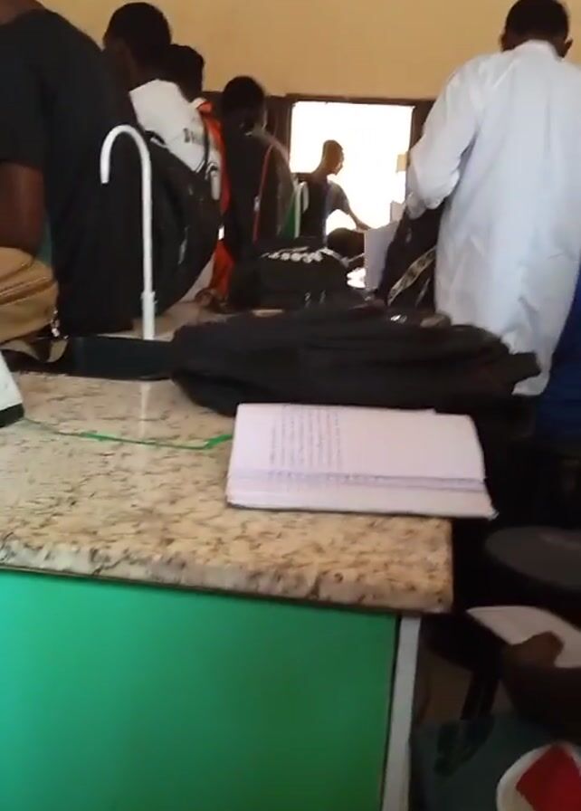 room with several young people, likely students, near a table with backpacks, papers, and other items. The camera focuses on a notebook with writing, seemingly notes from a class. People are standing or sitting around the table, but their activities are unclear. The environment appears to be a classroom or study area, and there's a general sense of activity and possibly conversation in the background.