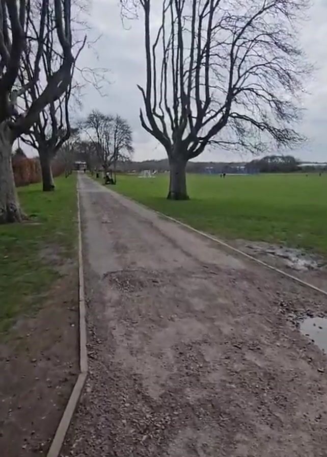 pathway through a park on a cloudy day. The path is gravel and has some puddles and rough patches. The path is lined with trees that have no leaves, and a grassy area is on the right. There are a few people in the distance on the grass, and a small structure is visible further down the path.