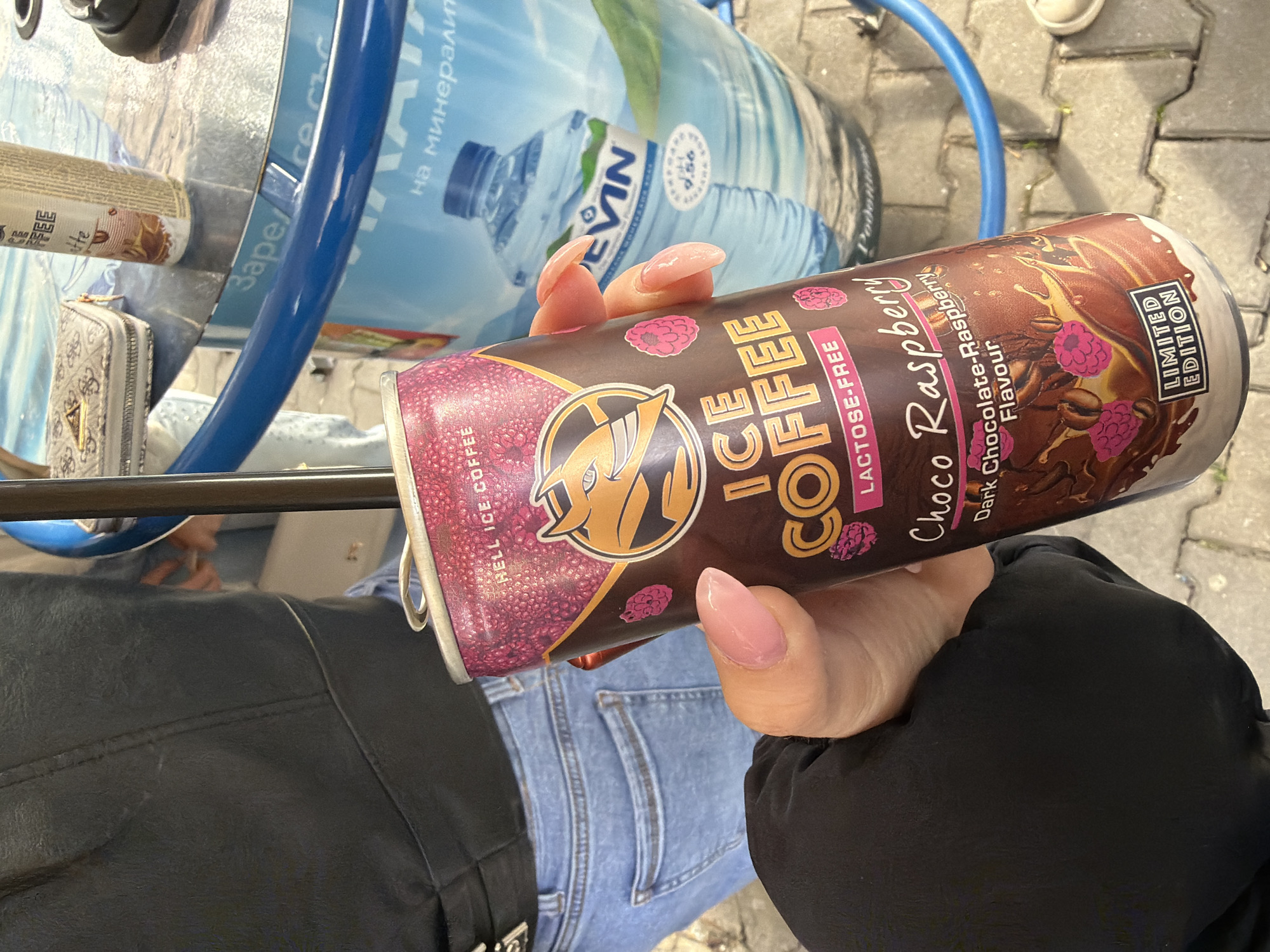 An individual's hand, featuring long, light pink manicured fingernails, holds a "HELL ICE COFFEE Choco Raspberry Dark Chocolate-Raspberry Flavour LIMITED EDITION Lactose-Free" can. A black straw is inserted into the can, which is primarily brown with pink raspberry graphics, gold lettering, and a horned devil logo. The individual is wearing a black outerwear garment and blue denim jeans with a black belt. In the background, a round, reflective metallic table holds a patterned Guess-branded wallet and a light-colored can labeled "Latte." A blue tubular rail or frame extends horizontally across the mid-ground. To the right, a large blue water dispenser is visible, displaying Bulgarian text, including "Заре... на минерална вода" and "DEVIN" mineral water branding with a "9.56" numerical label. The ground surface consists of grey interlocking pavers. This outdoor scene is located in Stara Zagora, Bulgaria.