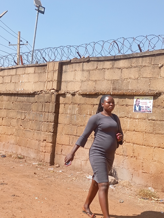 A woman in a gray dress and sandals walks along a dirt path. She holds a smartphone. Behind her is a tall brick wall topped with barbed wire. A light pole stands on the other side of the wall, and a small political poster is affixed to the wall. The sky is clear blue.