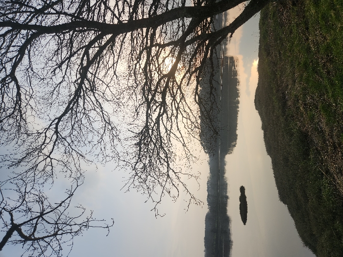 A static landscape photograph depicts a riverside scene in Auray, France, captured during either sunrise or sunset. The sun, a diffused yellow-orange light source, is positioned low in the sky on the upper-right, partially obscured by the dense, bare branches of a large, deciduous tree. This tree, silhouetted, dominates the right side and upper portions of the image, with its intricate branch network extending across the sky. The immediate foreground features a gently sloped bank covered in dry and sparse green grass, transitioning into darker vegetation at the water's edge. A wide, calm body of water, likely a river or estuary, occupies the central and left areas of the frame, reflecting the warm hues of the sky and sun. Approximately in the mid-left of the water, a small, dark, elongated island covered in low-lying vegetation is visible. The far bank across the water presents a distant, dark treeline, which is also reflected in the calm surface. The sky above is a pale blue, transitioning to warmer, brighter tones near the horizon. No individuals or discernible man-made structures are present within the frame.