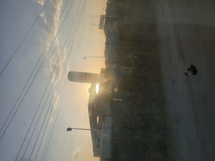 A tall water tower stands against a hazy, orange sky, obscuring the setting sun. The scene features buildings partially visible behind it, with streetlights and power lines stretching across the sky. The lower right side of the image is heavily obscured, likely by a dirty window, with a noticeable smudge.