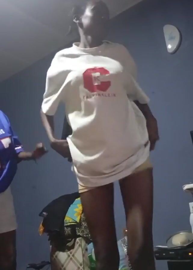 Two slender young women dance to music in a sparsely furnished room. The first woman, near the camera, wears an oversized white Calvin Klein t-shirt that obscures her shorts. She has long, dark legs and her hair is pulled back. The other woman wears a blue and white Buffalo Bills jersey with the number 17 and white shorts. A suitcase with clothing piled on it sits near the first woman. A black garment hangs on the wall. The walls are a dull blue and there is a decorative clock on the wall. The lighting in the room is dim.