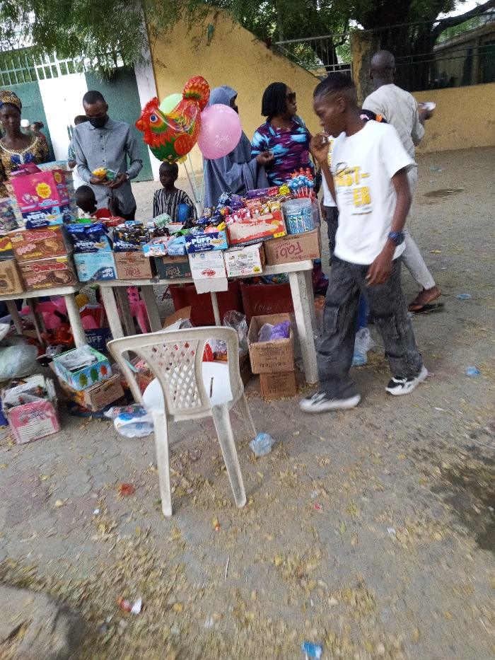 A street vendor's stall is laden with sweets, candies, and balloons, drawing a small crowd. Several adults and children are visible around the table, some examining the goods. A young man in a white t-shirt and cargo pants walks past, seemingly enjoying a snack. A white plastic chair sits nearby, and litter is scattered on the ground. A chicken-shaped balloon and a single pink balloon hover above the array of treats.