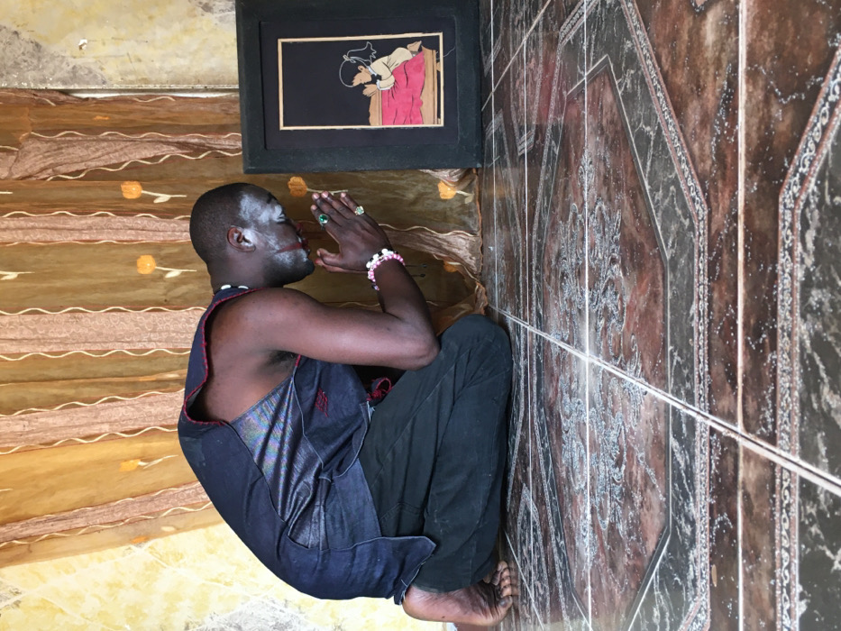 An adult male kneels on a tiled floor in Sabon Tasha, Nigeria. He is barefoot, facing right, with his head bowed and hands pressed together in front of his face, suggesting a prayer or contemplative posture. His skin is dark, and his face bears white markings on the forehead and cheeks, with red markings around his nose and mouth. He wears a dark blue sleeveless tunic with red trim and subtle patterns, over dark trousers. A white beaded necklace is visible, along with a pink and white beaded bracelet on his left wrist and rings on his fingers, including a green ring on his right index finger. To his right, a black-framed picture stands upright on the floor, depicting a stylized drawing of a child kneeling in prayer at a pink-covered bed. The floor features reddish-brown and dark grey patterned tiles. Behind the man and the picture, a light brown, semi-transparent curtain with subtle floral motifs hangs against a lighter-colored wall.