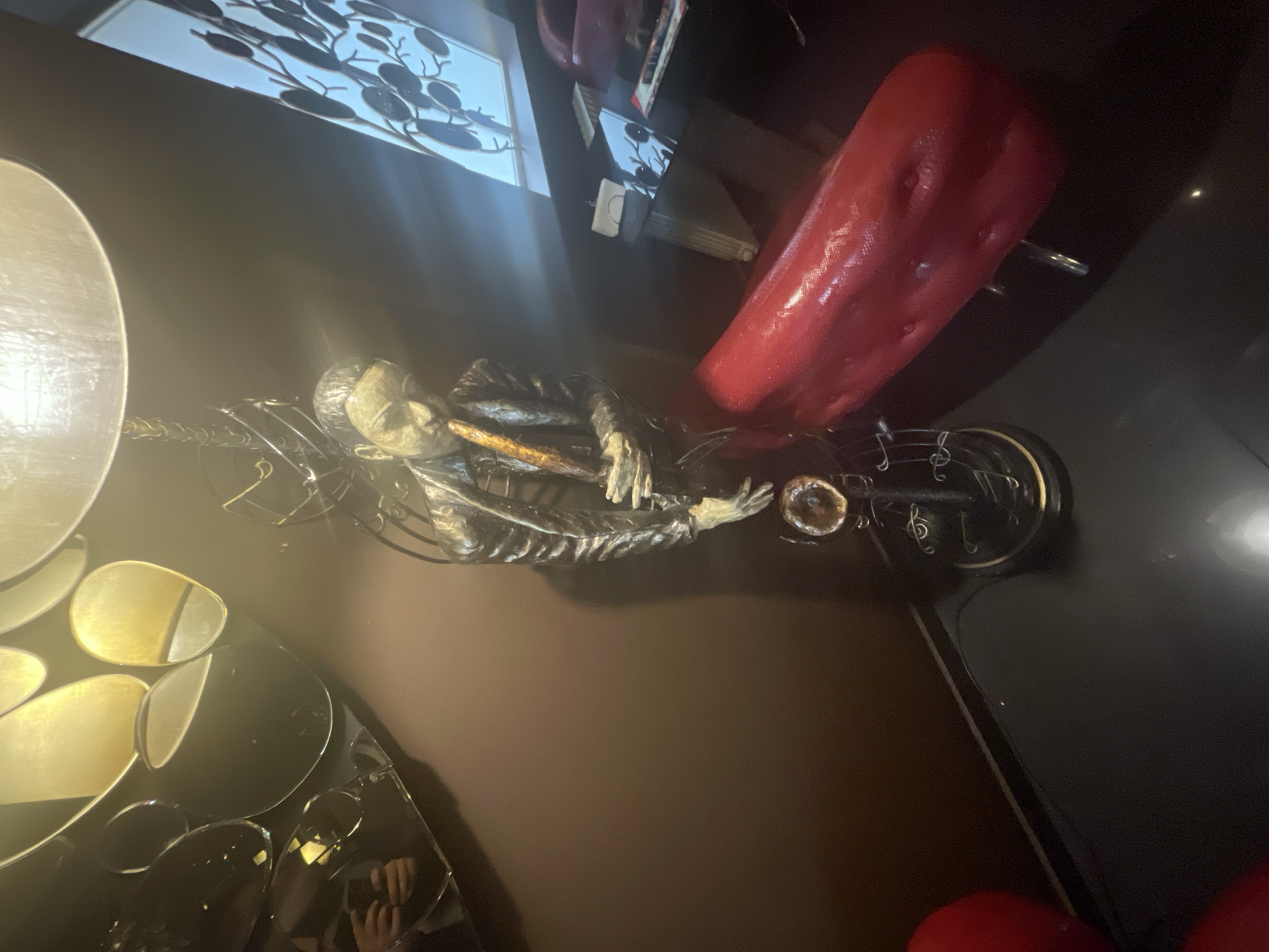 This appears to be an interior shot, possibly in a restaurant or bar in Sofia, Bulgaria. A sculpture of a human figure sits on a table next to a red upholstered chair. A decorative mirror is visible on the left of the frame. In the background, there is a window and a decorative metal design.