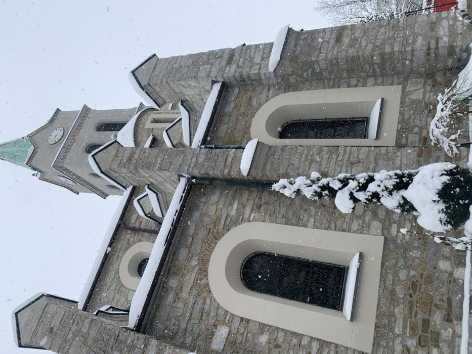 A stone church covered in snow, seen from a low angle