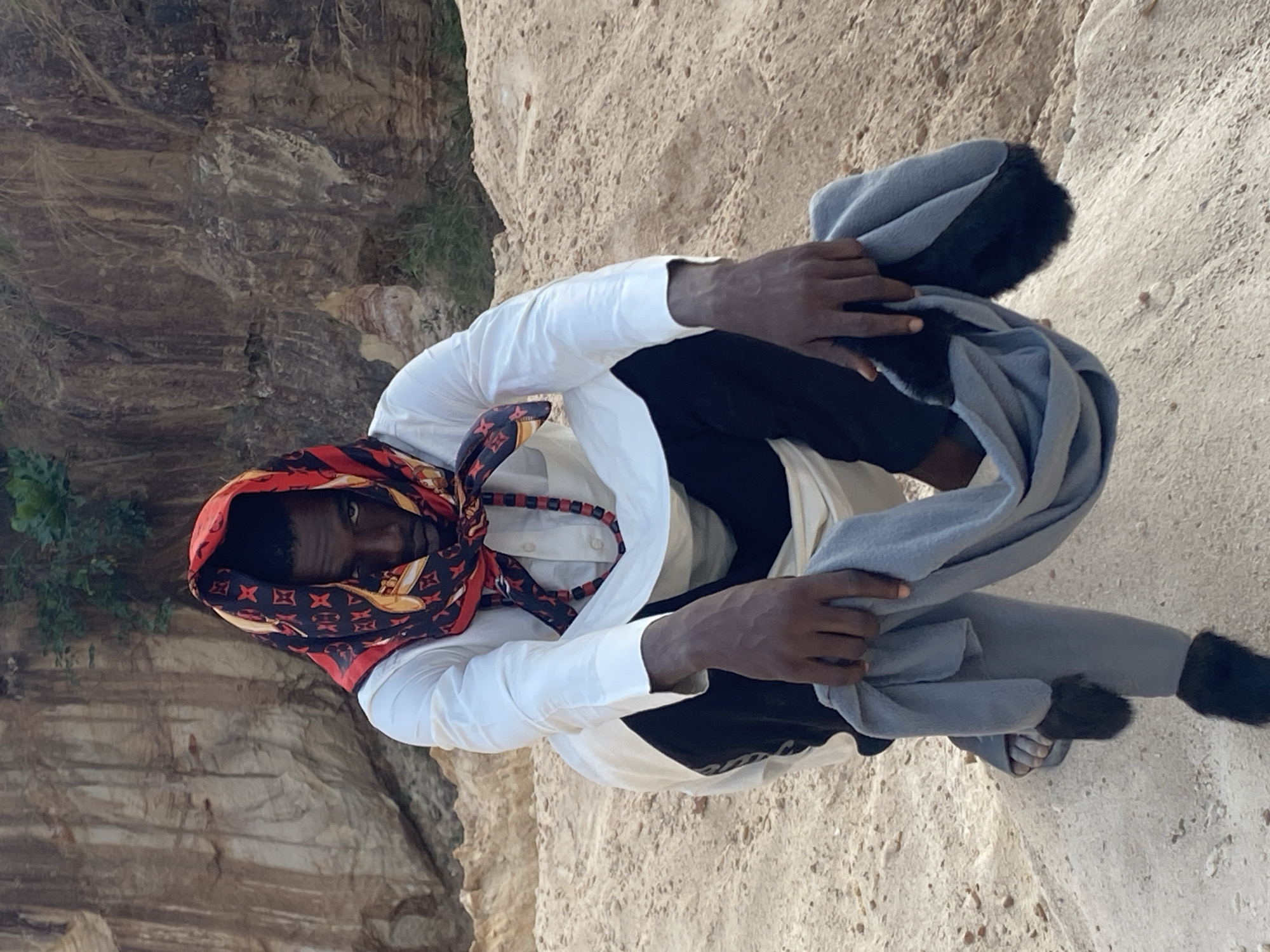 - "The image depicts a male individual in a crouched position, facing forward, against a backdrop of sandy terrain and a rock face, reportedly located in Achara, Nigeria" by FM-6XMFv1, licensed under CC BY 4.0