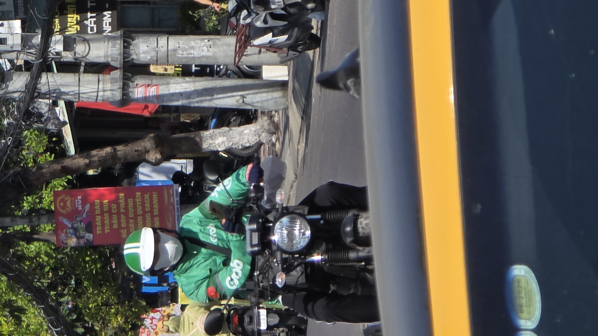 A Grab delivery driver on a motorcycle is positioned on a city street in Unknown, Vietnam. He wears a green Grab jacket and a white helmet with green stripes. The motorcycle faces the camera. Behind him, a campaign banner with the words "TOÀN DÂN THAM GIA BẦU CỬ" is attached to a tree. Electrical wires are strung above the street. In the background, street signs that say "Nguyen CẮT T NAM -" are visible. Several other motorcycles are parked on the side of the road. The photo is taken from inside a vehicle, as indicated by the vehicle's interior features. A yellow sticker is on the windshield of the vehicle, which reads "06/2026".