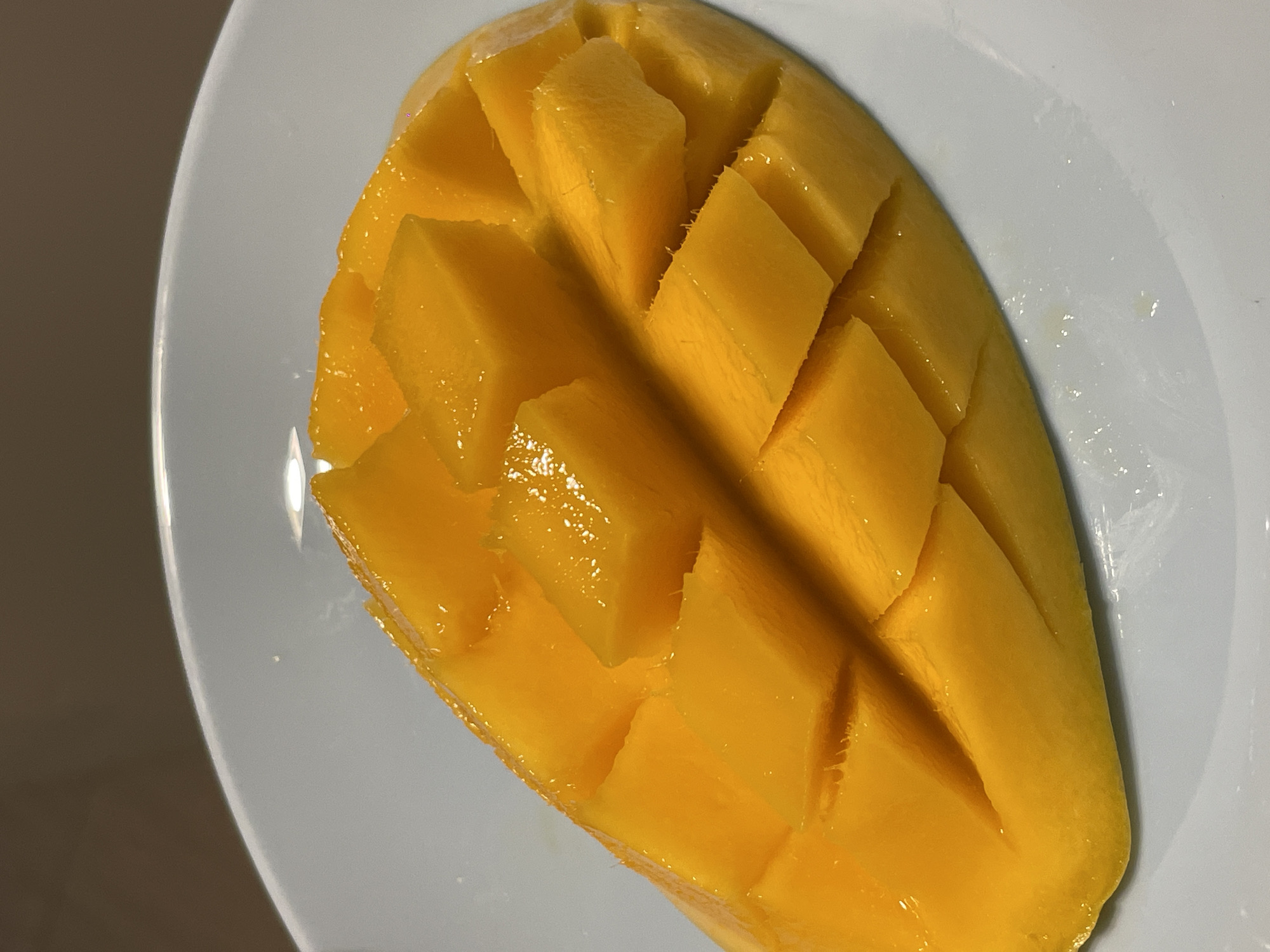 A ripe mango, prepared in a "hedgehog" cut style, rests on a light blue plate. The mango is a vibrant yellow color, and the cuts are visible, creating a pattern of raised cubes. The plate is glossy and reflects light. The background is a neutral beige or light brown color. The location is not discernable in the image.
