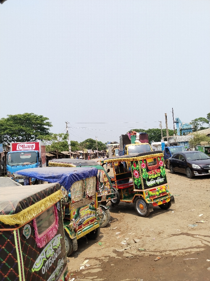 The scene depicts a bustling street in Pangasia, Bangladesh, captured from a slightly elevated perspective. The street is lined with colorful auto-rickshaws, known locally as "CNGs," parked along the side of the road. The auto-rickshaws are decorated with elaborate floral designs and adorned with fringes and tassels, showcasing the local culture and vibrant aesthetics of the area. Several other vehicles can be seen parked in the background, including a blue truck with a Bengali script advertisement on its side and a silver sedan. The ground is covered in a layer of dirt and debris, which is common in the region. The photograph was taken in daylight under a clear sky, indicating a bright and sunny day.