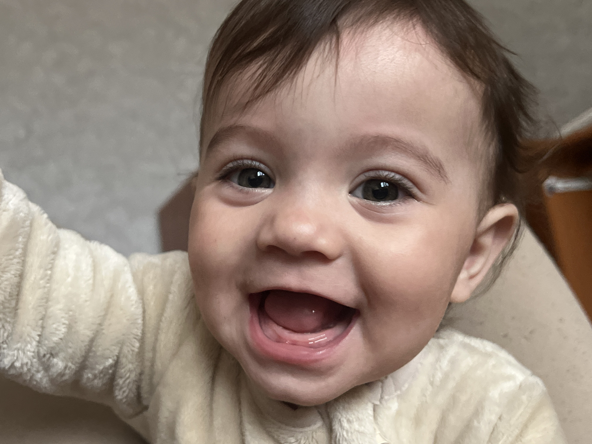 The image depicts a close-up, high-angle view of a single infant in an indoor setting. While the prompt specifies the location as the city of Elena, Bulgaria, the visual content of the image provides no identifiable geographic details to corroborate this. The infant subject possesses fair skin, dark brown, fine hair, and dark brown or hazel eyes that are wide open and directed towards the camera. The infant displays a wide, open-mouthed smile or laugh, revealing the tongue and upper/lower gums; no teeth are visibly erupted. The lips are pink. The infant is dressed in a cream-colored, soft, plush, and textured garment, possibly a one-piece or top, with visible ribbing or shirring on the left shoulder/arm area. The background is softly blurred and appears to consist of a light grey, possibly textured wall or fabric on the left and upper left, transitioning to a warmer, light brown or orange tone on the right, potentially indicating furniture or another individual. The lighting is soft and even.