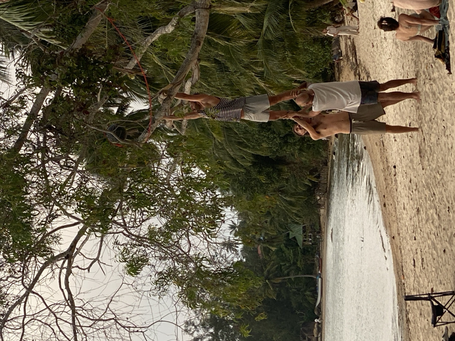 The scene depicts a tropical beach in Baan Sri Thanu, Thailand, under an overcast sky. In the foreground, three adult males are performing a balancing act on the sandy beach. One male, wearing a horizontally striped tank top and light grey shorts, is suspended, hanging from a thick tree branch with both hands, while his feet are supported on the shoulders of two other men below him. The man on the left supporting him is shirtless, wears dark grey shorts, and looks up smiling. The man on the right wears a white t-shirt and dark shorts, supporting the suspended individual's right leg. Above the group, a red rope is visible strung between tree branches. A dark, spherical object hangs from a higher branch. To the immediate right of the balancing act, a woman with dark hair is seated on the sand, facing away from the viewer, wearing a light-colored top. A black folding chair is positioned on the far left of the foreground. The midground features a calm bay with rippling water extending from the sandy shore. The background is dominated by dense tropical vegetation, including numerous palm trees and other foliage, indicating a lush environment. On the distant shore across the bay, a small, light-colored structure with a green roof is visible amidst the trees, along with several small boats beached near the waterline. Additional distant figures are present on the far beach, including one individual prominently standing in light-colored attire. The overall lighting suggests an early morning or late afternoon with diffused daylight.