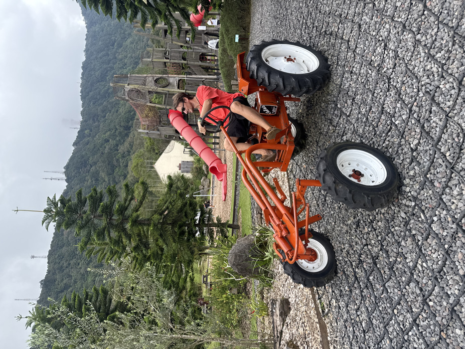 An individual sits on a small orange tractor at a park. The tractor has three tires and is placed on a rocky surface. Behind the tractor, there is a large wooden play structure and green trees. A man with sunglasses and a red shirt steers the tractor, and a red tube is fixed to the front. In the background, a cloudy sky overlooks a forested mountain landscape with tall antenna towers visible.