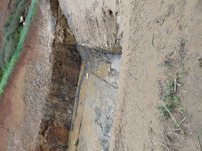 A construction site features deep trenches exposing layers of soil